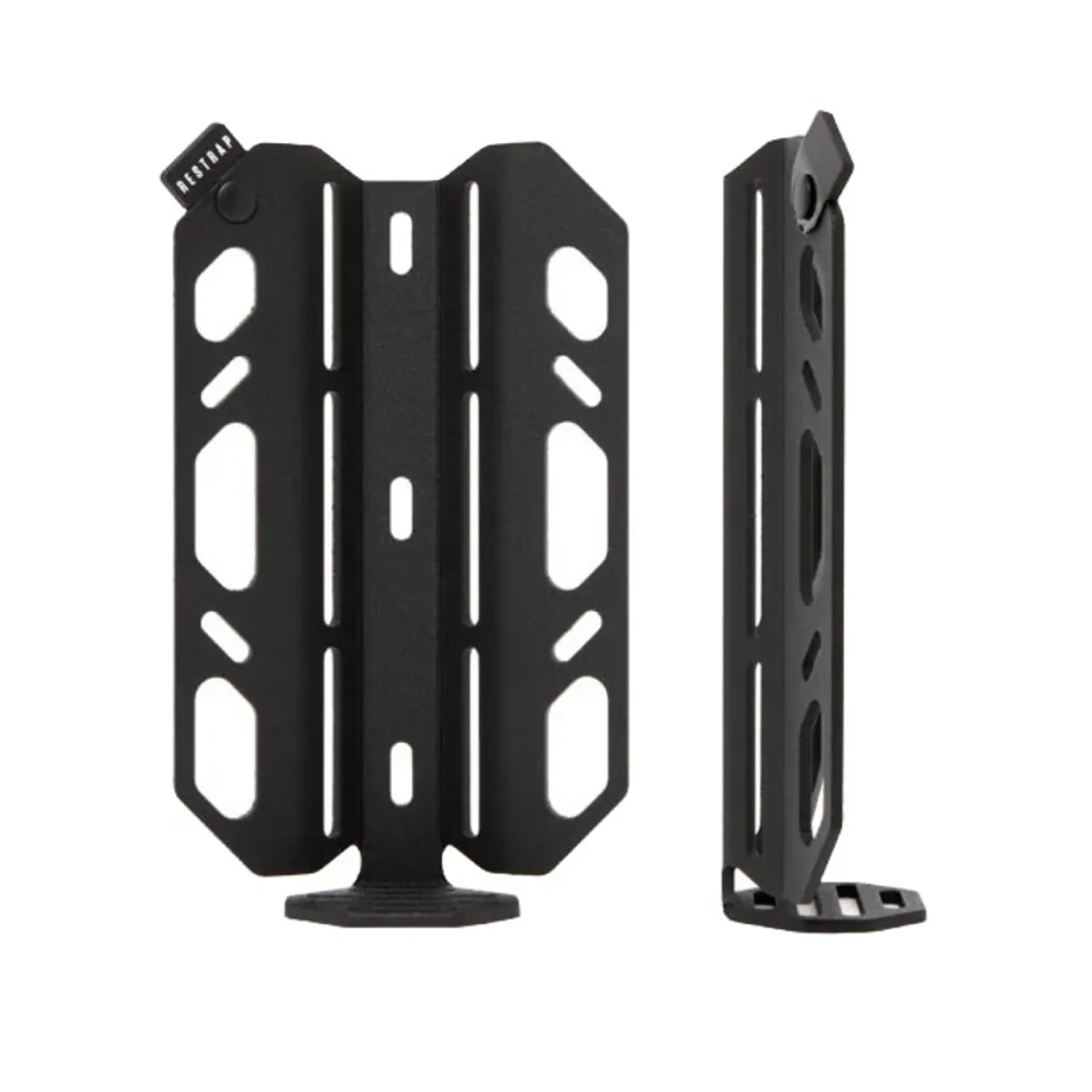 • The carry cage is made from laser cut aluminum and finished with a black powder coating and restrap branded rubber label. For guidance on fitting, please follow manufacturers recommendation for your frame/forks.