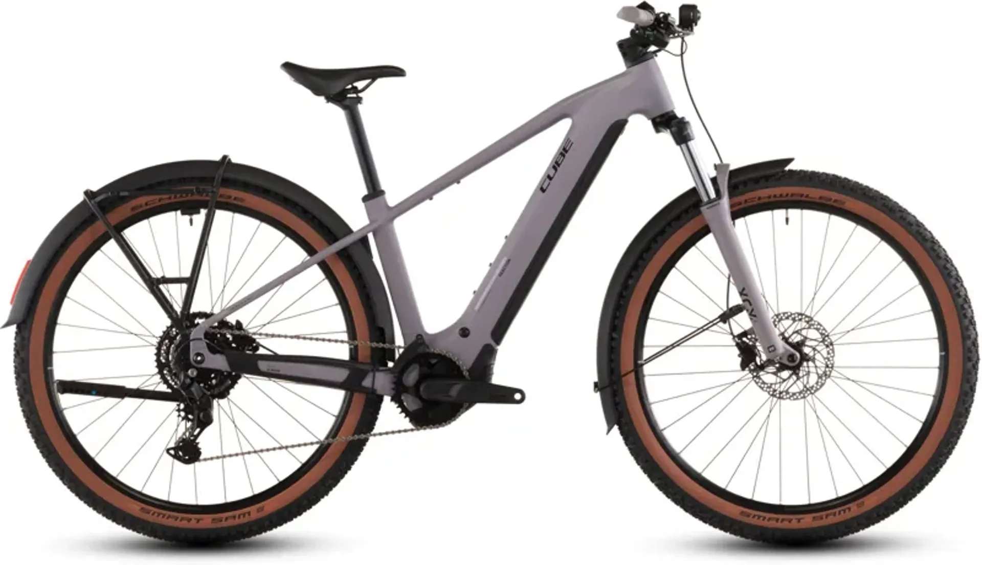 Bosch's powerful Performance motor, with a 600Wh battery, and easy-shifting Shimano Cues 9-speed gears keep you moving. Powerful Shimano hydraulic disc brakes ensure you can always stop safely, whatever the weather. There's a suspension fork with 120mm travel (100mm for smaller frame sizes) for tackling city potholes and rooty trails, grippy Schwalbe Smart Sam 6.6cm (2.6") tyres, and a comfy saddle and grips for day-long comfort.